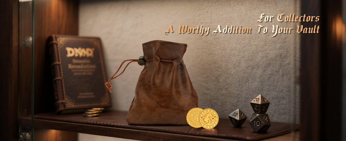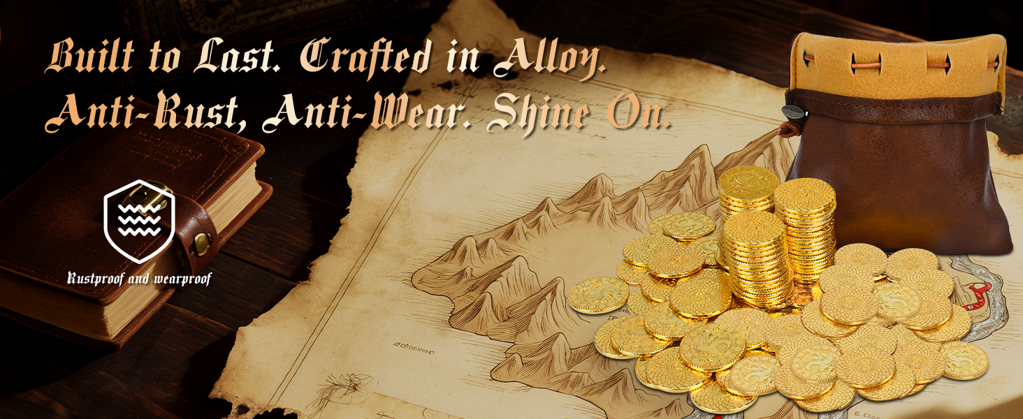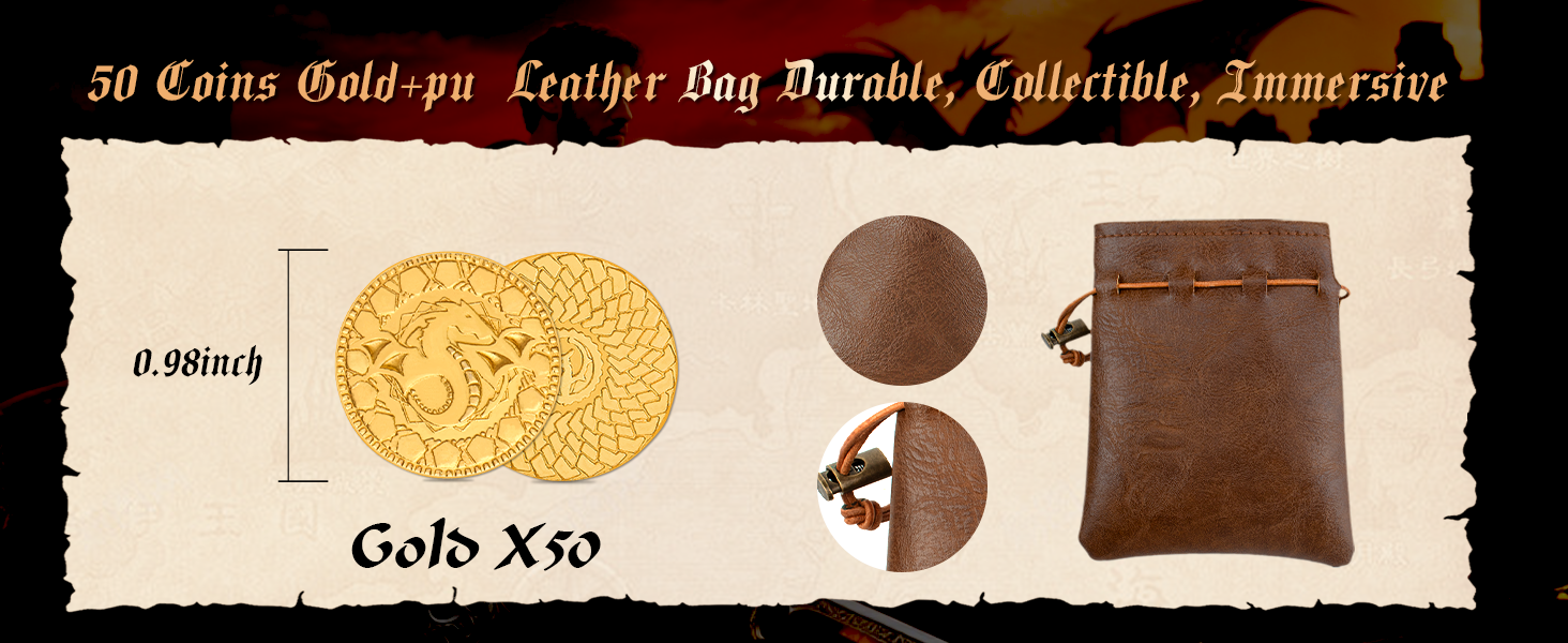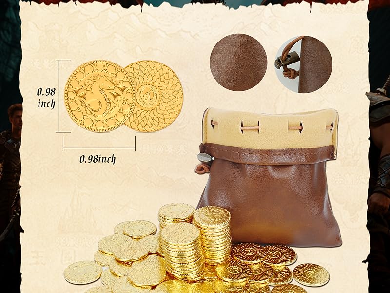 50 PCS DND Fantasy Metal Gold Coins & Leather Pouch for Dungeons & Dragons Novelty Tabletop RPG Board Games Tokens Treasure Coins for Party Tablelap Games Accessories Addons Medieval Game