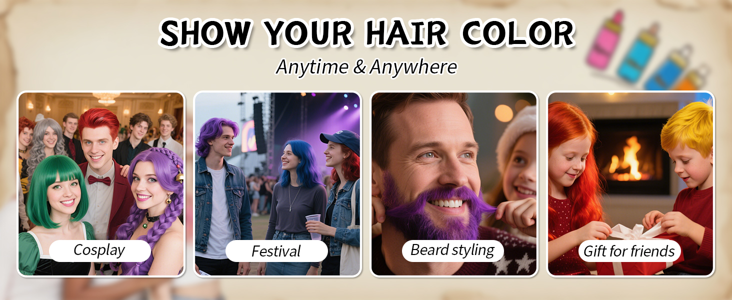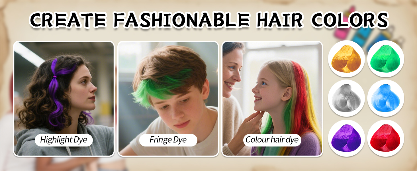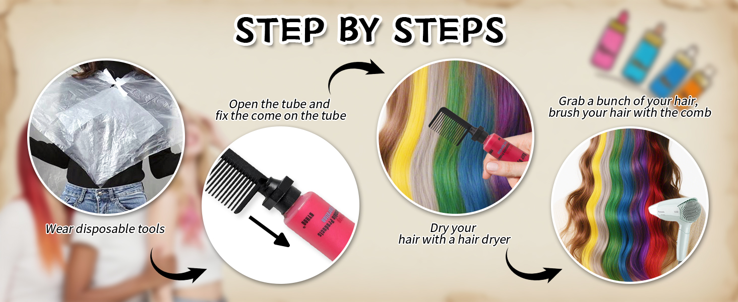 • 【Vibrant Coloul】We provide six bright colors include green, silver, yellow, red, purple, and blue. The combination of warm colors and cool colors can be used for various hairstyles. Use them togather or use the individual colour to get a beautiful layer of your hair color. PLEASE NOTE: the capacity of each color of temporary hair dye is limited, so it may not be able to cover all your hair